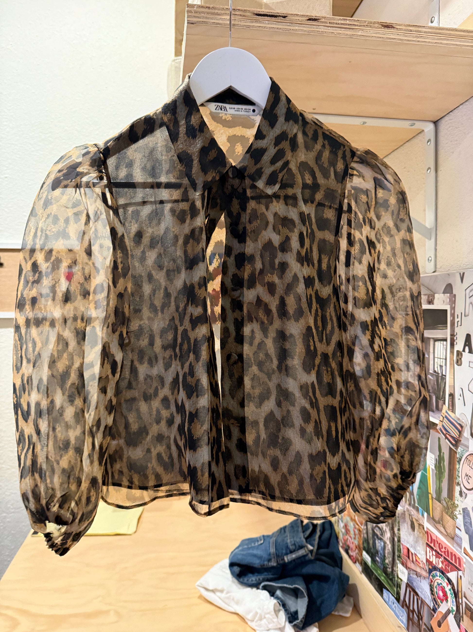ZARA SHEER LEOPARD PUFF SLEEVE Organza BLOUSE, Cropped
